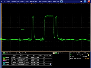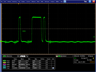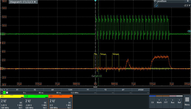 1. Read addr 0x33 register, Green scope is 12.5M TP_SCK, yellow scope is TP_SDI, orange scope is TP_MUXOUT