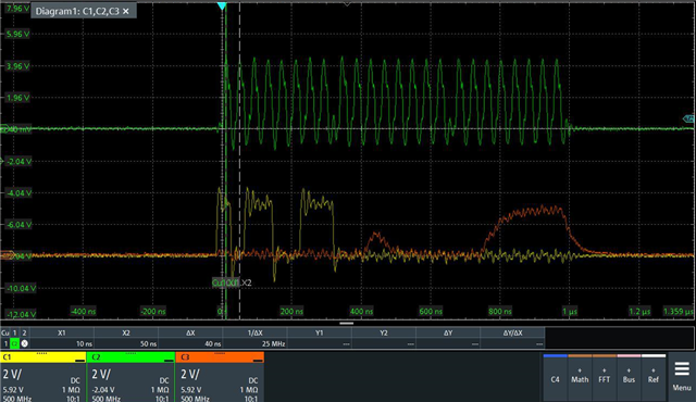 2. Read addr 0x33 register ,Green scope is 25M TP_SCK, yellow scope is TP_SDI, orange scope is TP_MUXOUT