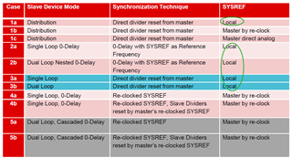 In the multi-device sync approach, there are various options to generate and distribute the SYSREF from secondary (slave) devices to data converters/FPGAs. Once the secondary LMKs are synchronized, SYSREF can be generated and controlled from secondary device itself (called "Local") or controlled from primary (master) device (re-clocked by Master).