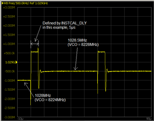 In VCO and VCO Divider mode, the frequency hopping lock time for instant calibration is between 6-7us. However, according to the manual, the instant calibration time is 2.5us and in VCO Doubler mode, the frequency hopping lock time is 60-70us.