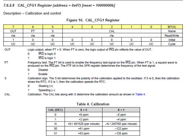 Can you explain a bit more about the issues you're having with the CAL_CFG1 register? There's a description of the calibration process in this thread: https://e2e.ti.com/support/clock-timing-group/clock-and-timing/f/clock-timing-forum/703635/bq32002-bq32002-improper-time#pi320966=1