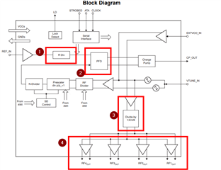 1. Two frequency dividers in the forward path to LO: Reference & RF divider. 1/2/4/8
