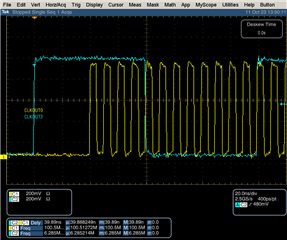 For a 90° phase shift at 6.25MHz, the delay between outputs should be 40 ns. Since delay = DDLY Code / Clock distribution frequency: DDLY Code = 40 ns * 3000 MHz = 120. So this means that there needs to be a difference of 120 in the DDLY code between 2 outputs to have a delay of 40 ns between them. I set the DDLY code for the 100 MHz output to be 130, and 10 for the 6.25 MHz output.