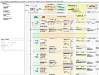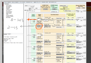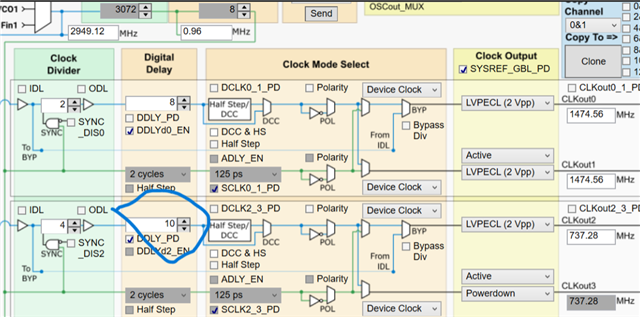 The DDLY code has a minimum value of 8 and a max value of 1023. The actual delay measurement equals the DDLY code multiplied by the period of the clock distribution frequency (seen at the top of the "Clock outputs" page).