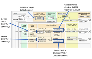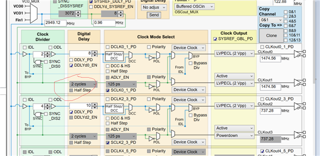 The DDLY code that ranges from 8-1023 is for both CLKout0 and CLKout1 if the device clock is selected. The 2nd box that ranges from 2-15 is for both CLKout0 and CLKout1 if the SYSREF clock is selected, and would be adding to the SYSREF delay at the top of the page. Essentially the device clock DDLY works independently from the SYSREF DDLY. Hopefully this picture makes things a little more clear