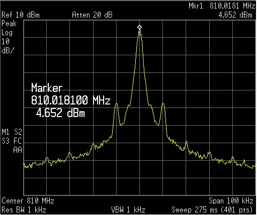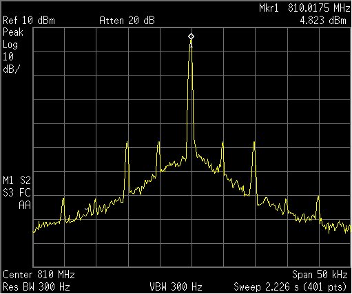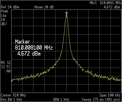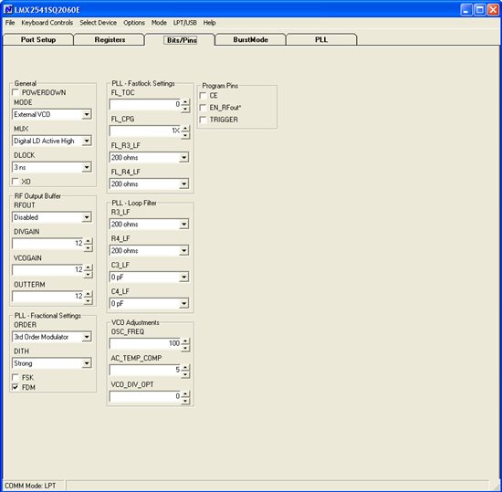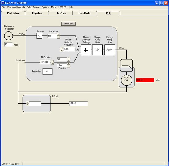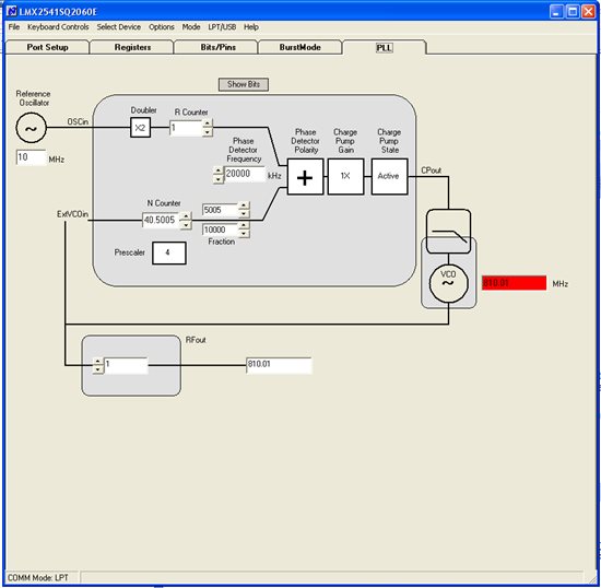 I am working on a project which uses the LMX2541 PLL+VCO chip to generate an ultra-low noise carrier frequency at 810.01 MHz. I am using an external VCO working from 805 MHz to 815 MHz and an external reference XO working at 10 MHz (The LMX2541 is working in External VCO mode.). The RFoutEN is turned off and I am extracting the 810.01 MHz signal directly from the VCO chip. The LMX2541's registers are configured as shown below.
