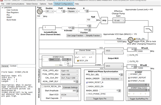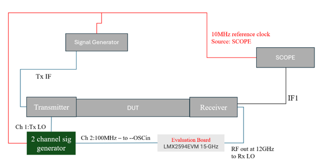 Following your suggestion, I used a signal generator to feed a 100 MHz signal into the OSCin input of the LMX2594EVM. The signal generator is locked to the system's 10 MHz reference clock, so the 100 MHz signal should be synchronous with the rest of the setup.