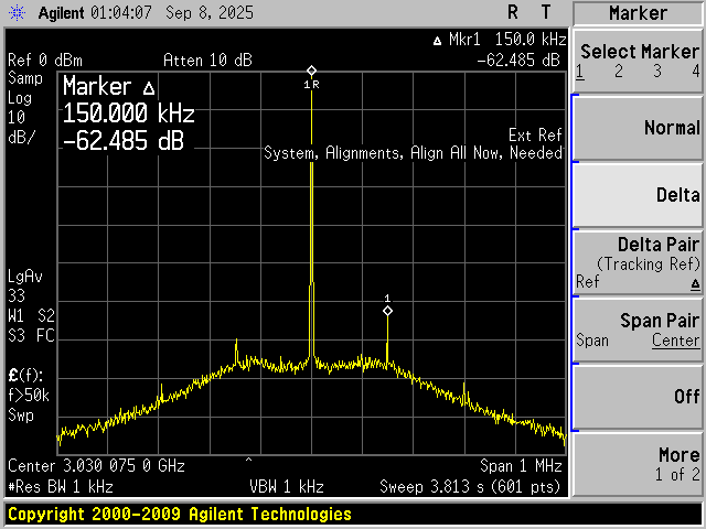 At 3030.975MHz, expected spurs is 75kHz, 150kHz, etc.