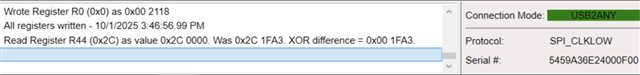 Using TICS Pro We used the default configuration of Default Mode 2018-4-24, set the MUXout_SW Switch 1 and Switch 2 to Make and Break respectively (Section 2.7 of datasheet), and set the MUXOUT_LD_SEL to Readback (Section 3.2.6). Then we set register 44 to a known value (0x1FA3), write all registers, and then used the "read back register" function. Please note that after writing all registers the current draw jumps from 245mA to 260mA.