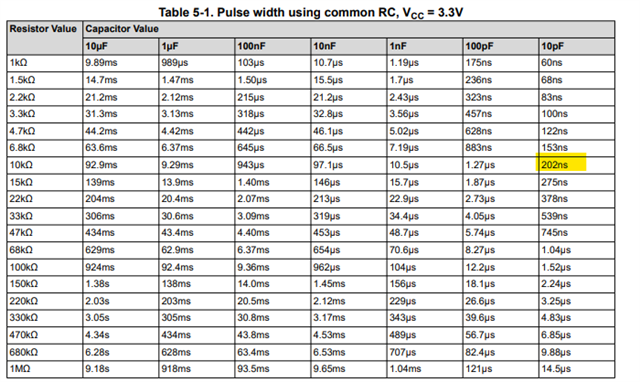 I am working on the circuit where TLC555 should able to produce 200ns monopluse. i have used formula for time calculation T=1.1*R*C. But in TIN TI mono pulse is 450ns. Please can help in the single monopluse generation. Please, find the attached schematic and waveform.