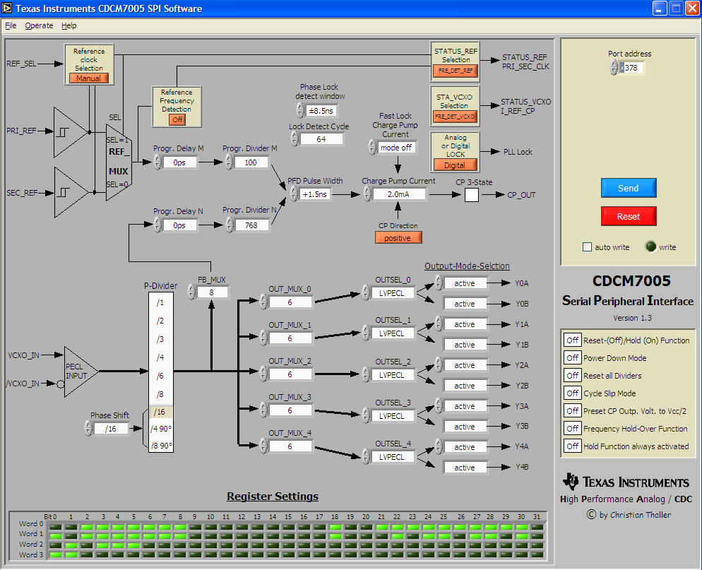 3. Is there any frequency planner available for CDCM7005 (Such as one available for CDCM61001 http://e2e.ti.com/support/clocks/m/videos__files/576535.aspx ). I want to derive the VCXO frequency for the 10MHz reference and 102.4MHz output with the possible M, N & P divider values.