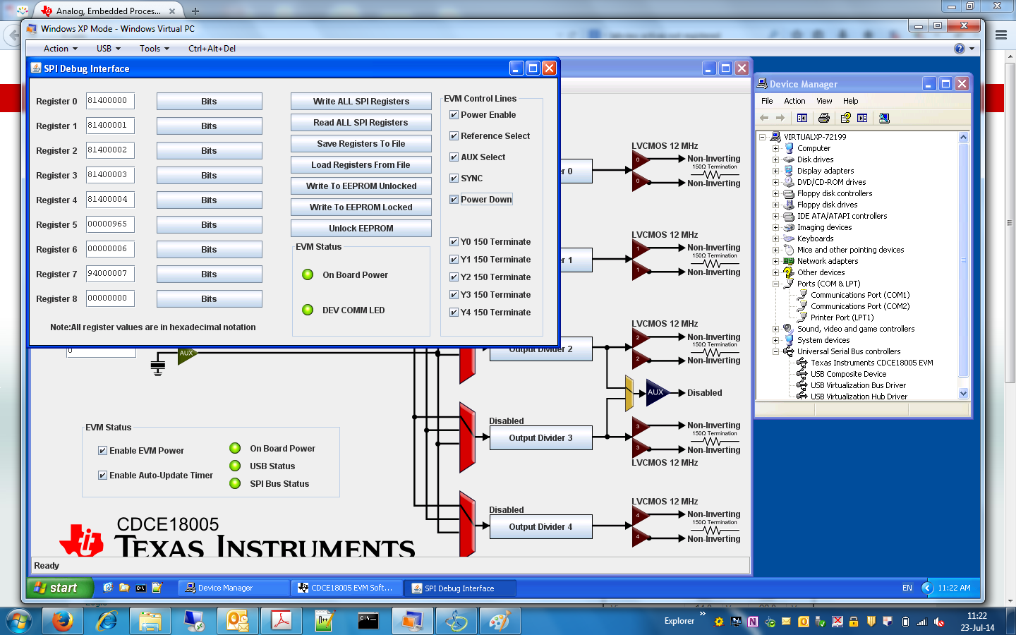 Please be aware that USB device drivers are not automatically loaded. You have to "attach" the unidentified device using the virtual machine menu at the top (USB/ "unidentified device" Attach). Then the EVM driver becomes active and you will see the EVM come up in the device manager as in the screenshot.