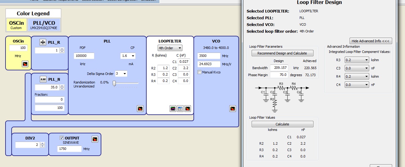 I was trying to find the design for an 4th order loop filter to be used with an lmx2541 with an output frequency range of 3.48GHz to 4GHz. The wizard mode suggests lmx2541 for the design, however the loop filter design displays all values as zero. However, the tool works for some other frequencies and gives me the design. Can someone tell me the reason for this?
