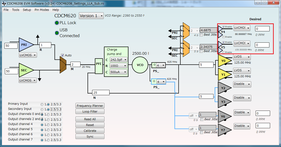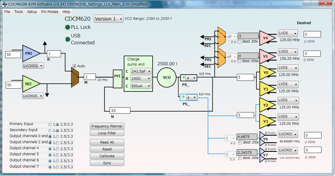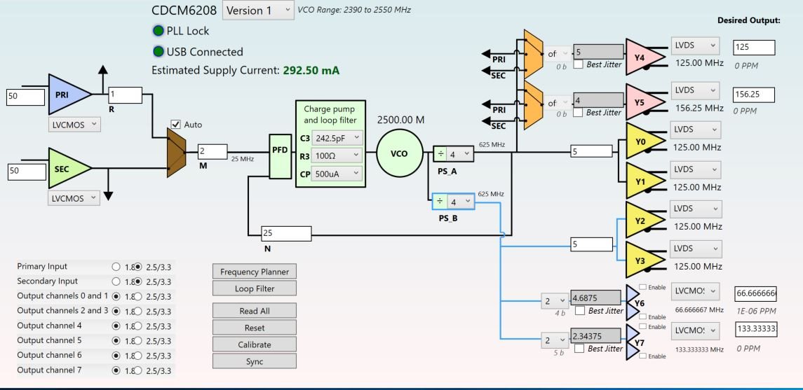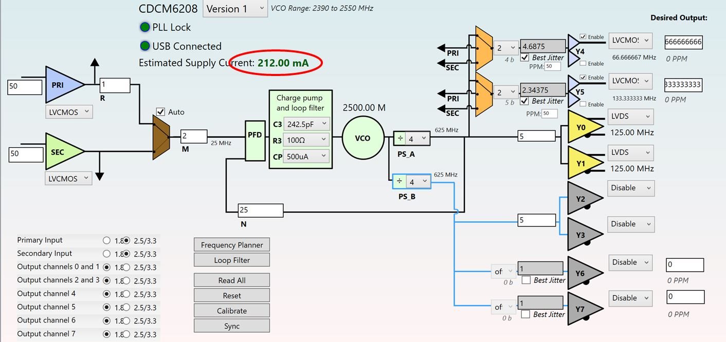 The CDCM6208 User GUI does an excellent job estimating the total device current consumption based on the actual device configuration. Therefore, TI recommends using the GUI to estimate device power consumption.