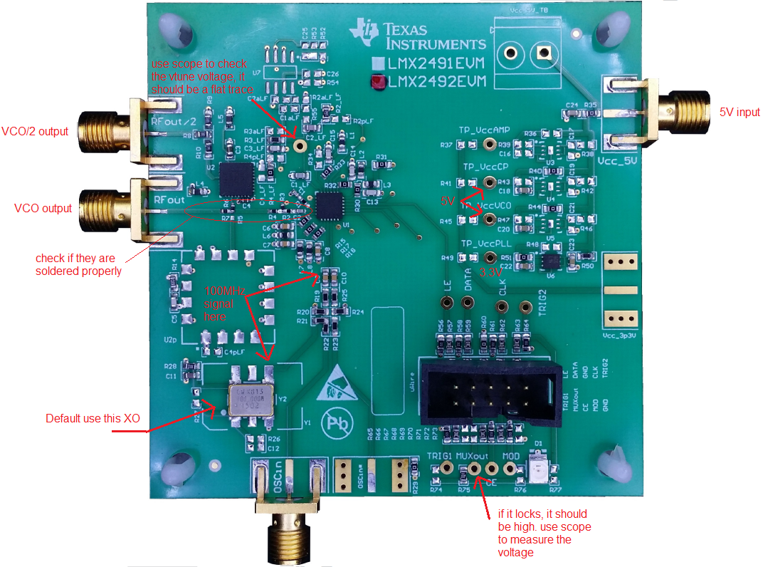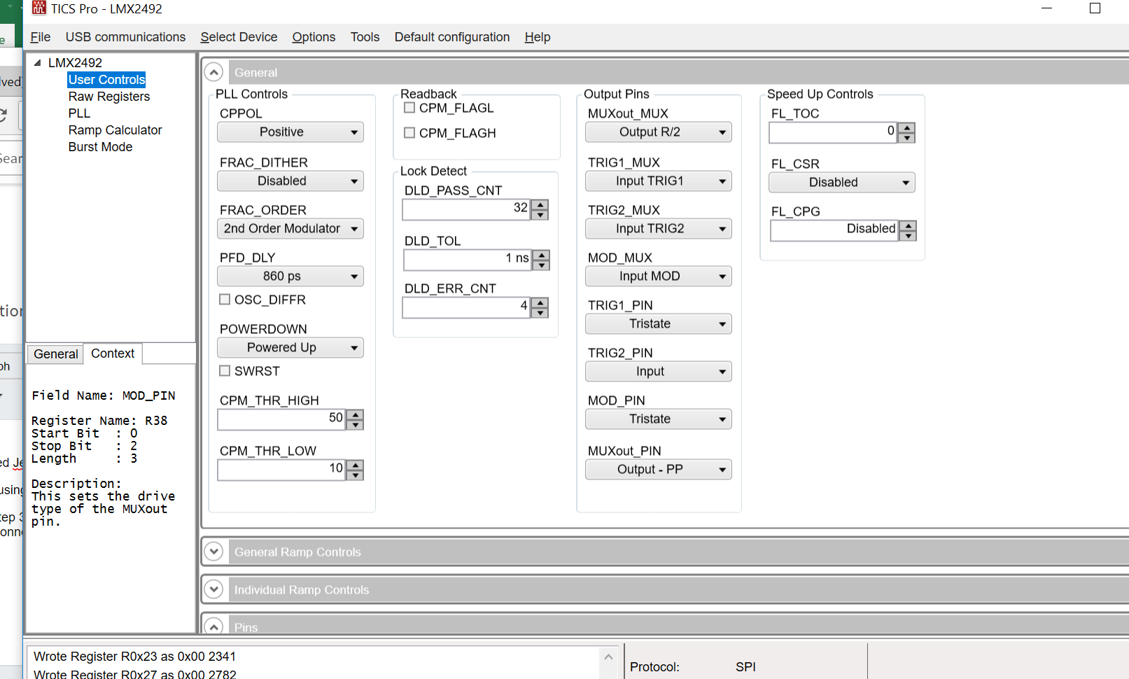 I've been trying to get the LMX2492 to work, just to replicate the continuous sawtooth ramp in the EVM user guide. I have trouble changing the VCO frequency, and can't see any ramping at all. I cannot replicate any of the user guide examples.