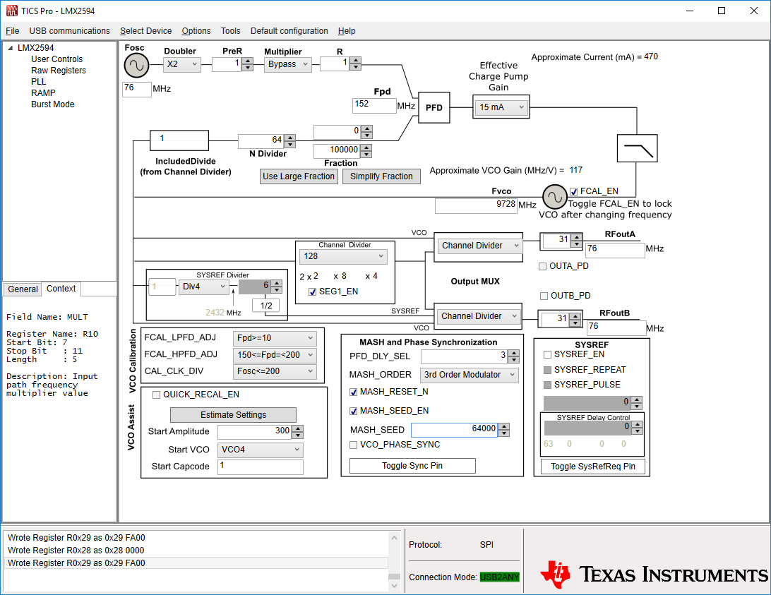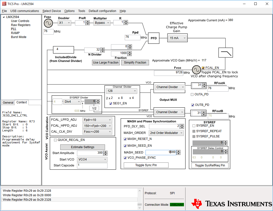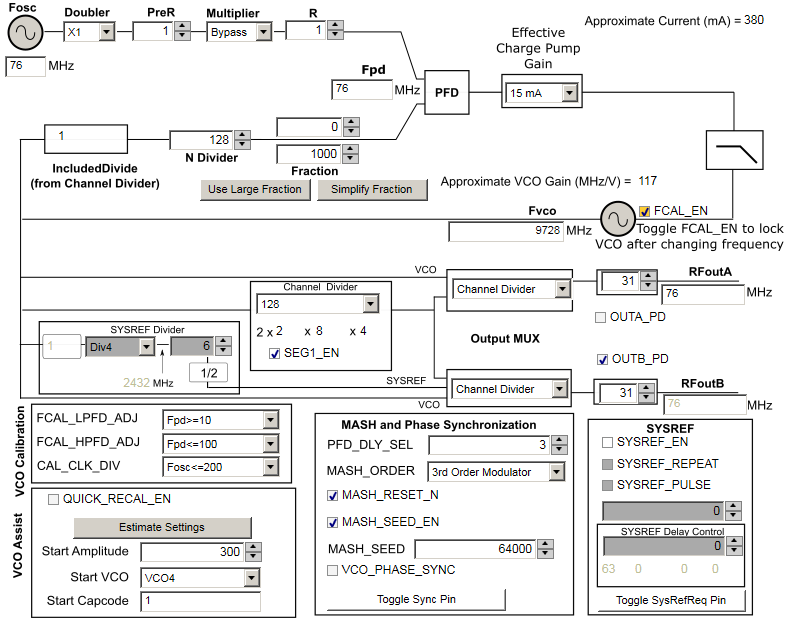 If I am interpreting these variables correctly from the TICS Pro GUI I do not see anything like this relationship. On the same page of the manual it seems to suggest (its not written clearly!) that VCO_PHASE_SYNC needs to be 1 for this phase shifting to work - is this true? I also do not know how I can determine (or alter) the FRAC_ORDER from the TICS Pro GUI.