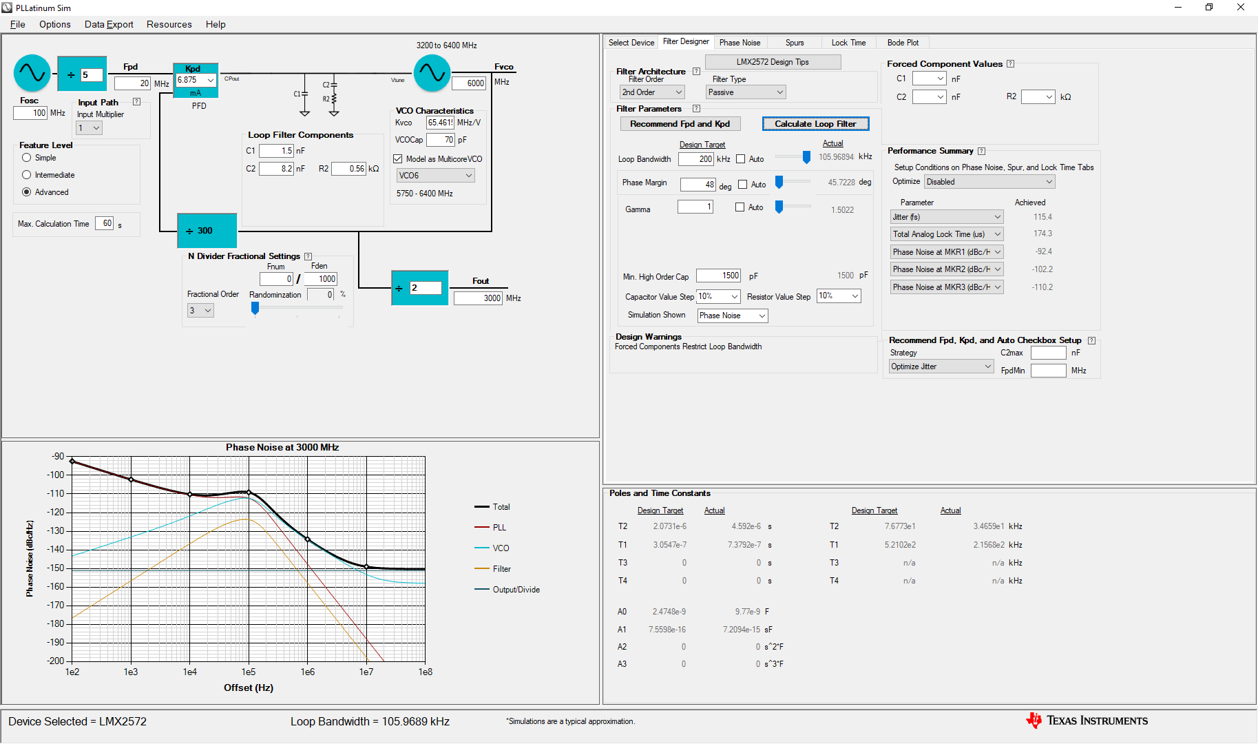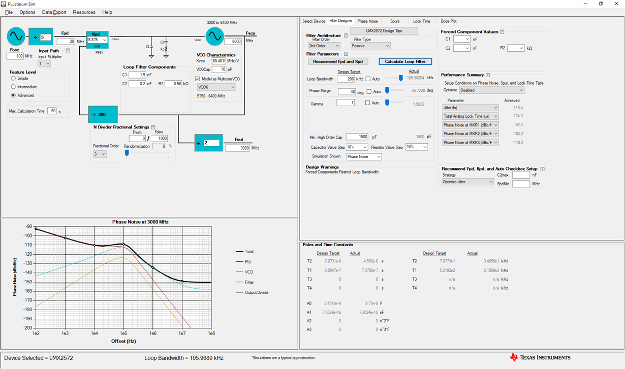 i would like to set the loop bandwidth to 200 kHz to increase the lock time. But PLLatinium limits the Bandwidth to 100kHz. I'm not sure why, maybe the input capacitance of the VCO is limiting? An active filter can remove this limit. I prefer a type b, 3.oder filter. Is it possible to invert the charge current on LMX2572?
