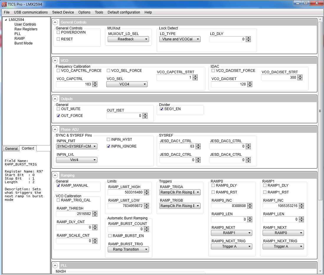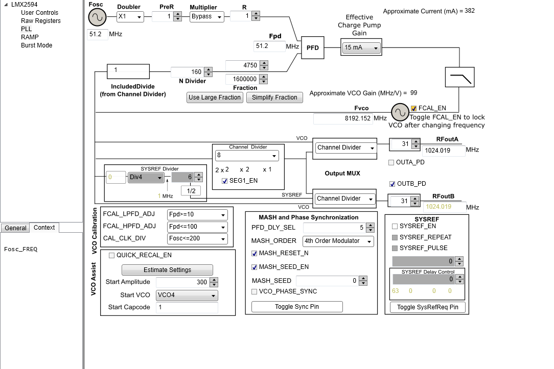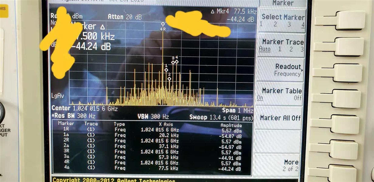 The configuration of the LMX2594 is as follows: Foscin = 51.2MHz, the output target signal fout = 1024.019MHz, and the configuration of other registers is shown in Figure 1 and Figure 2. The result of the output signal is shown in Figure 3. Note that the output signal is already locked.
