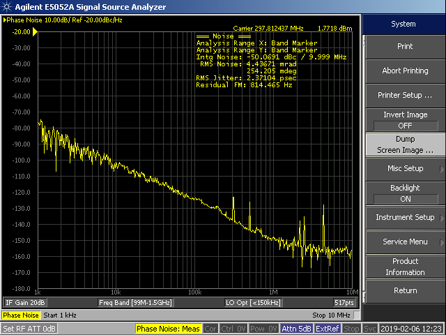 We have a board with two FPGAs and four LMK04828s. Each FPGA programs two of the LMK04828s. However, each of the four LMK04828s share the same oscillator reference which is fanned out using a low jitter LVDS buffer. The two LMK04828s programmed by the first FPGA appear to have acceptable phase noise performance compared to the baseline taken using the evaluation board. However, the other two LMK04828s connected to the second FPGA have terrible phase noise under 100k offset and the charge pump output pin appears to have a sawtooth-like waveform. The first two LMK04828s are identical in schematic design to the second set of LMK04828s and their layouts are very similar, but not 100% the same. I do not understand what could possibly be going on with the second set connected to FPGA 2. They are like this on all boards so its not just a one-off issue. I am including screenshots of the eval board basline which has about 287fs of jitter, an output of one of the second LMK04828 on the first FPGA & its CPout value, and an output of the second LMK04828 on the second FPGA & its CPout value. Also included screenshots of part of the schematic showing the output used to connect to the E5052A. This output has 240 ohm bias resistors since the output is LVPECL. Also shown is a schematic showing the clock reference and fanout buffer.