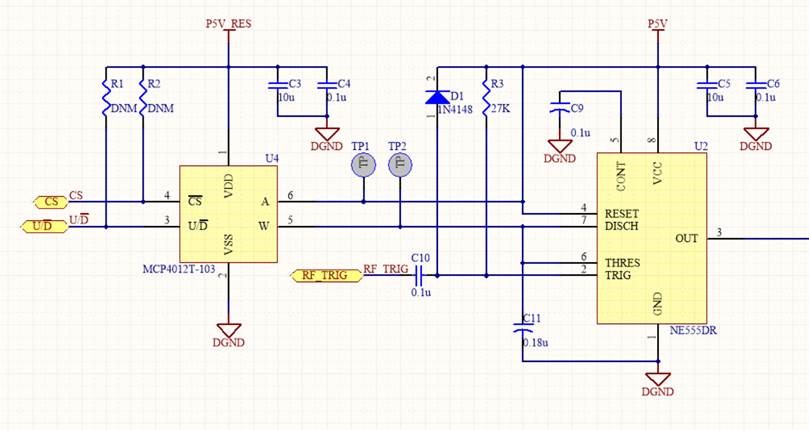 The problem is before the NE555DR is mounted on the PCB, the MCP4012T-103 digital potential meter is functional, and I can measure the resistance on TP1 and TP2. However, after I mount the 555 timer on the PCB, the resistance of MCP4012T-103 becomes infinity and no output from NE555DR. Could you help to check what is wrong of my circuit? How do I improve it?