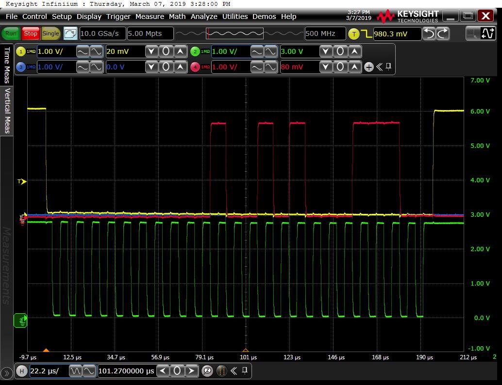 I have used a Raspberry Pi 3 B+ to control the LMX2594 (instead of the Reference Pro), and the Full Assist mode. As you can see, the time between the last bit of one word and the lock detect rising edge is relatively stable. However that's not the case between the CSB rising edge and the Lock Detect rising edge.