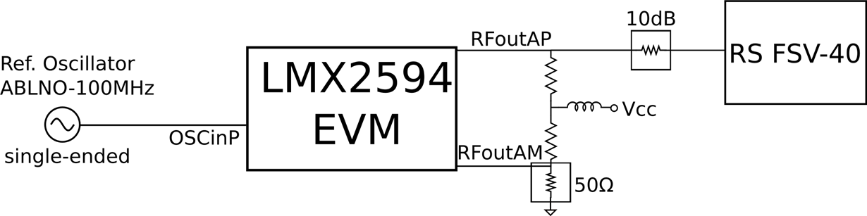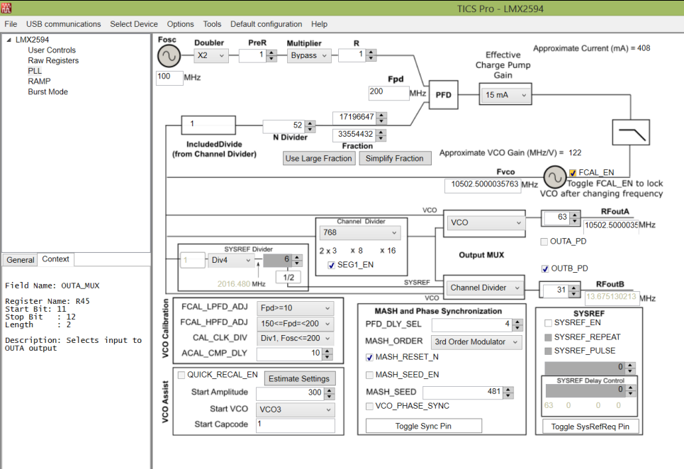The LMX2594 settings used are shown below and set using the TICS Pro software:
