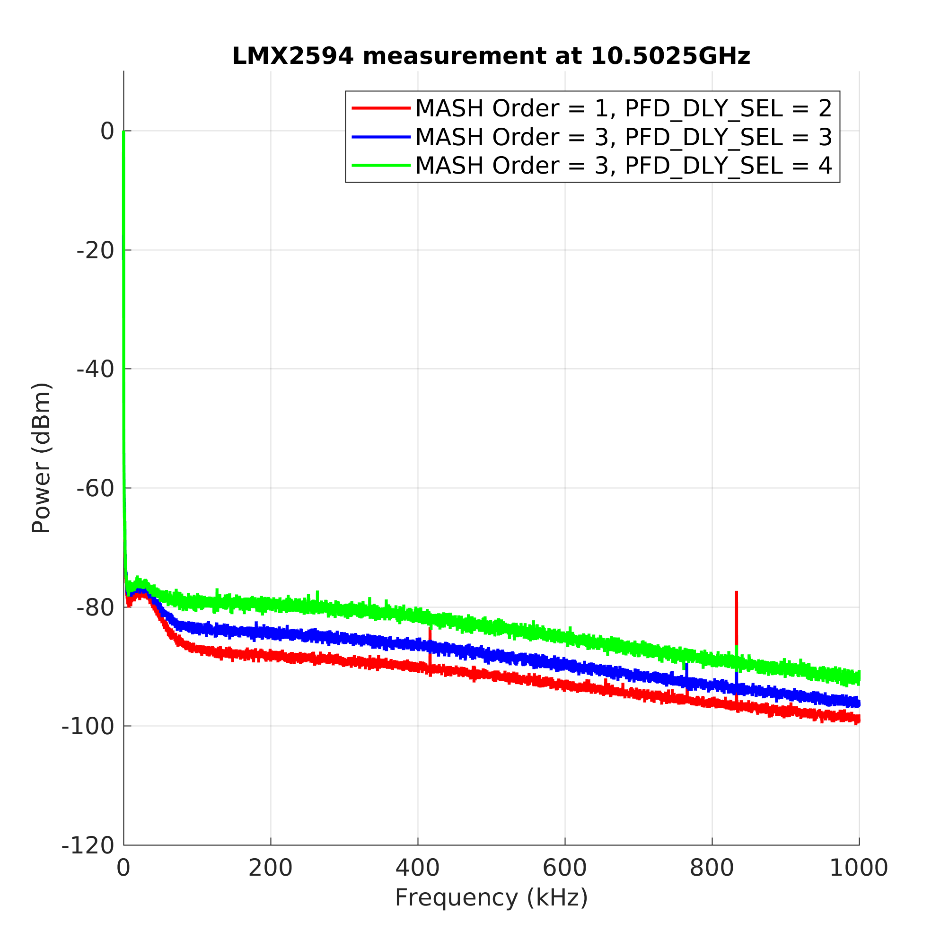 We have been evaluating the performance of the LMX2594 (LMX2594EVM) and found that using the recommended setting for PFD_DLY_SEL (given in table 2 of the datasheet), when the MASH order is set to 3 gives a measured phase noise that is worse than using a smaller value for this setting.