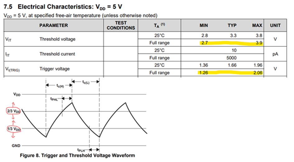 I would like to know the relationship between the threshold voltage Vit and the trigger voltage Vi(trig) on TLC555-Q1. Do you have one? If Vit=2.7V and Vi(trig)=2.06V, the duty gets very small. Are there any possibilities to show such a condition?