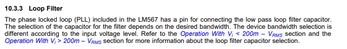 These are LM567C are older devices and there is no expertise remaining within the business unit to support technical questions on these devices.