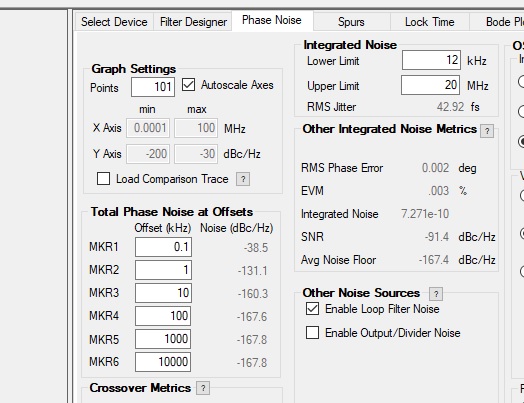 1. When analyzing PLL1 with the intent of using it as an input to PLL2, and when planning to have the VCXO frequency of PLL1 be the input frequency to PLL2, is it correct to uncheck "Enable Output/Divider Noise" under other noise sources?