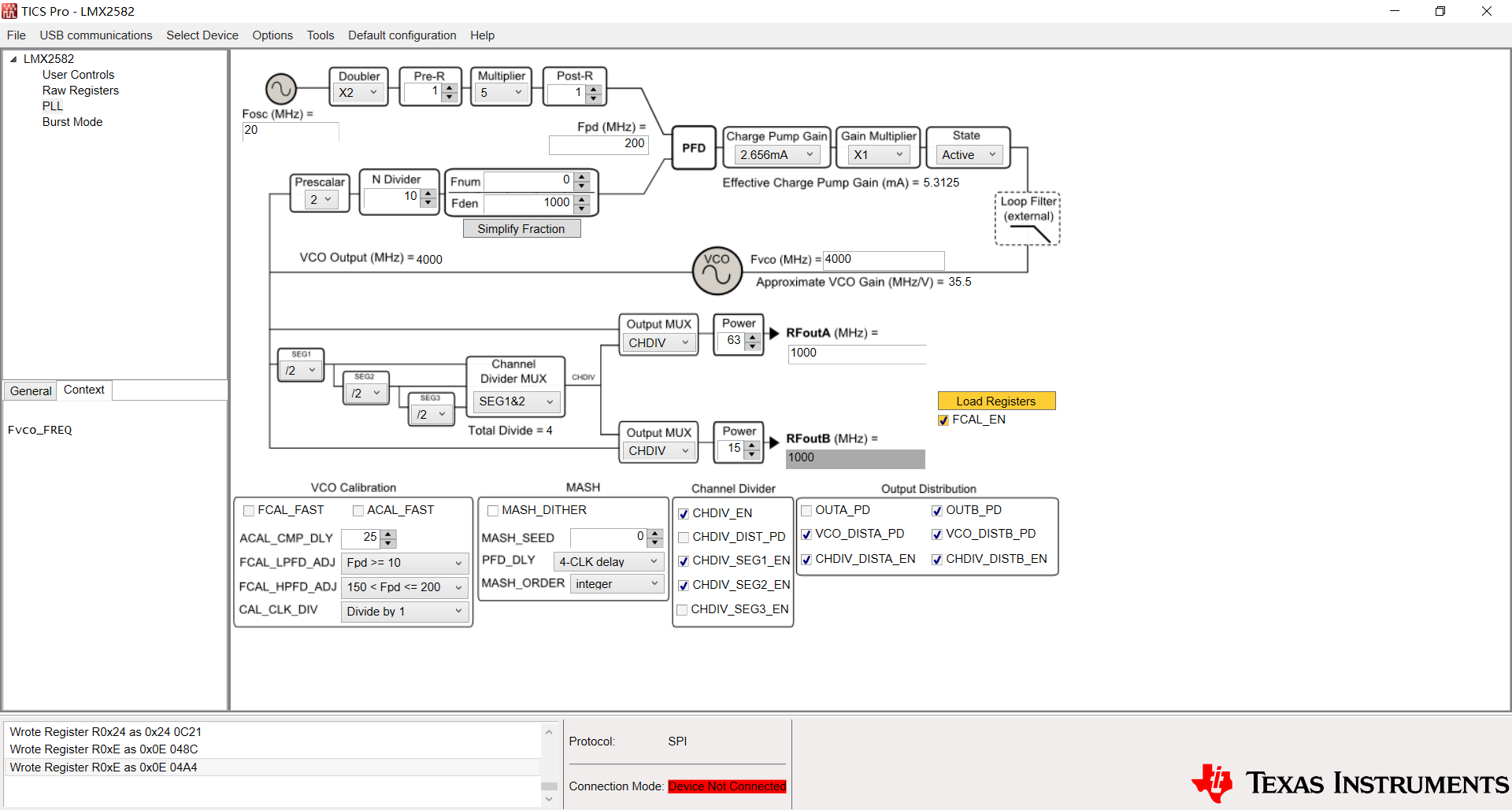I used the TICS Pro v1.7.0.0 to configure my lmx2582 & Texas Instruments Loop Filter Calculator v1.3.0. to change the loop filter parameters.