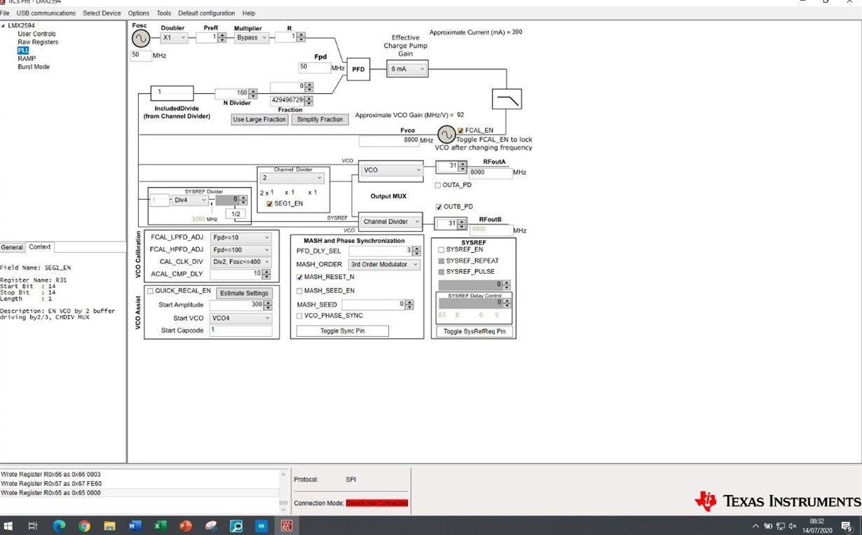 I'm using the LMX2595EVM along with the reference pro and I am trying to produce a ramp from 8000MHz to 8100MHz over a 1024us period and for it to only do the RAMP0 function and it seems that when I turn the ramping function on it does the ramp once and then goes back to being a CW frequency. I am using an external Oscillator at 50MHZ instead of the integrated 100MHz one on the EVM board. I've posted my setup. Any help would be appreciated.