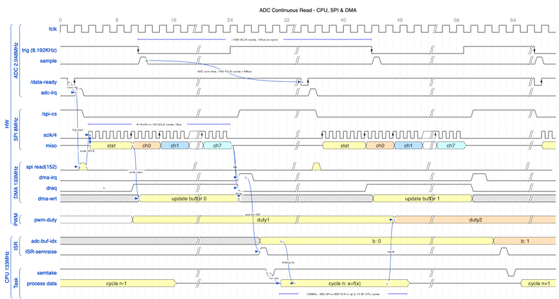 I am also at a loss as to how to "ask" the ADC to send SCLK pulses for the read data at the correct time... the only thing I can think of is monitoring the DRDY signal from the ADC to trigger the DMA unit to request a fixed 152 bit frame from the ADC's SPI channel, which would in turn cause SCLK pulses to be sent which the ADC uses to transmit data.... is that right? I'm asking because basically none of the software I have seen code for actually implements READC mode, although some mention it.