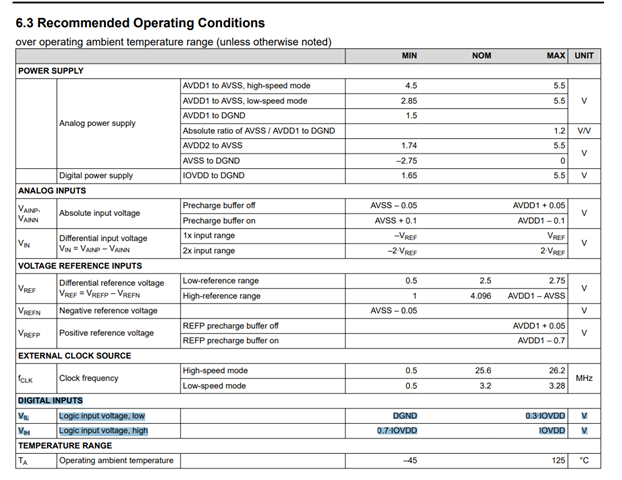 The digital input thresholds are defined by your IOVDD supply voltage. For example if IOVDD is 5V then your input LOW threshold (VIL) will be a maximum of 0.3 * IOVDD = 1.5V and your input HIGH threshold (VIH) will be a minimum of 0.7 * IOVDD = 3.5V.