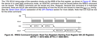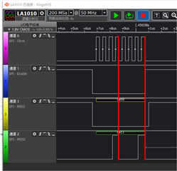 According to the instructions of the datasheet, I send the SDATAC instruction first, then delay 2μs (frequency is 2MHz), then send 0x20 0x01 (ID register address is 00h), resulting in the following waveform.