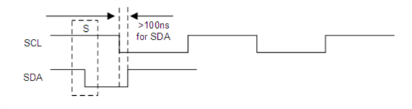 If SDA is used as the device address, hold the SDA line low for at least 100 ns after the SCL line goes low to make sure the device decodes the address correctly during I2C communication.