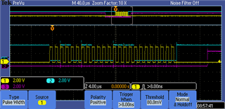 I'm sending SPI frames, 24 clock cycles long, 24 bits long, into the data line (TP6).