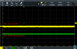 Please probe the GPIO2 test point (TP7) and share the oscilloscope capture. Please trigger the oscilloscope when you the FPGA drives SYNCb low. If you set the horizontal timescale wide, you can manually trigger the oscilloscope for one time capture and then assert SYNCb with the FPGA.