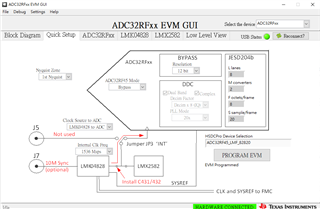 There should be no ADC register writes needed. The JESD RX (ie FPGA) controls the link initialization. Is the FPGA pll locking? I am not able to offer much more help on this. The ADC config should be fine when you press PROGRAM EVM button. The only thing that may change would be the FPGA reference clock divider. If this is not correct the FPGA transceiver PLL may not be locking.