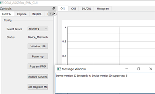 While following the ADS9219EVM user guide steps to get started, prior configuration steps completed OK, but the "Initialize ADS92xx" button in the GUI config tab (user guide section 3.2.3) reported back a "Device_Mismatch" status with a log message (see image below).