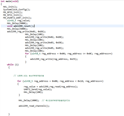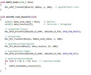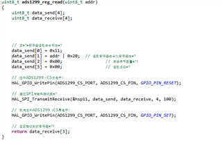 I have attached a screenshot of my code. Before I added ads1299_read_channel1() in the int main function, I could write and read all the registers correctly, but when I added this instruction, the whole logic started to get messy. I want to know if it is because my ads1299_read_channel1() is incorrect? Or is it because of other problems?