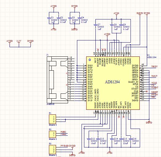 Hello everybody, This is my first post in this forum, I hope someone can give me some advices for my project. I'm going to work with an ADS1294 in my university project and I have some doubts about the connections. At first I'm going to describe in brief my project, I have to design an ECG system, it has to be portable so I have constraints about the size of my PCB that's why I think about to use a basic connection of this device , I mean I want to use the minimum number of components and get the best performance as possible of my ECG system. My issue is that I'm not completely sure about my schematic, I'm using the connection that I saw in the datasheet (Connecting the Device to Unipolar (+3V/+1.8V) Supplies) but I don't know if this configuration is enough for getting a good performance of the ADS1294 besides I want to use a single 3.3v power supply in order to save space.
