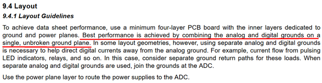 My use case is to continuously retrieve SPI data from the ADS127L21. Would this cause noise in the analog supply that would warrant me to separate the grounds? Or still not necessary and I can combine? There is no other switching or disturbance on the board. It is a simple board: the ADC gets the voltage data from a temp sensor then sends it to a MCU through SPI.
