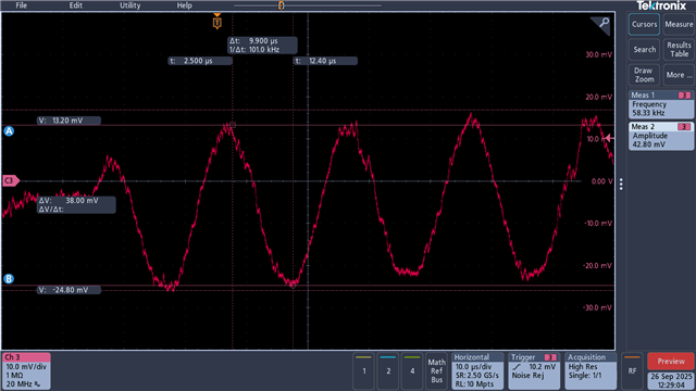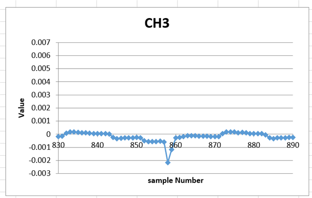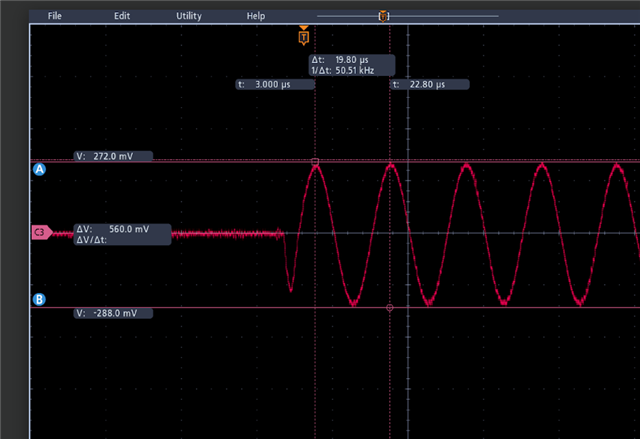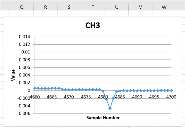 We see a spike in the output at the beginning and end of the 1mS burst signal. We did measure the analog input at the ADC after the RC filter in the EVM. We could not see any spikes.