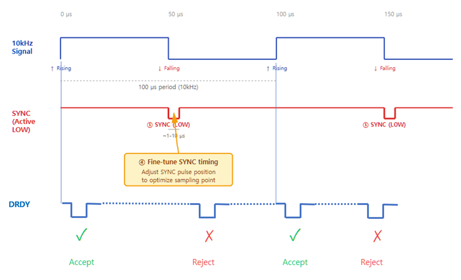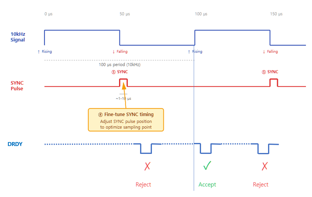 - Adjust when the SYNC pulse is generated to fine-tune where the sampling occurs within each 10 kHz period