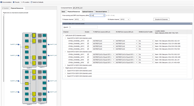 The refclk 245.76 MHz is used to generate an additional 245.76 MHz mgt_gpio_out clk using BUFG_GT. This mgt_gpio_out is used clk_in input for sys_pll which generates two identical frequency 61.44 MHz sys_clock and mgt_freerun_clock. By passing vio_inst in TI_204c_IP_ref. The simulation successfully works. Finally I made bit file for the receiver setting IP_TYPE "RX". The setting is shown in photo as below.