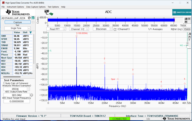 Firstly I have checked the ADC ADS54J60EVM using TSW14J50. (SERDES= 4.9152Gb/s, Device frequeny =983.04 MHz, LMFS=8224, Function generator frequency 100 MHz 10dBm power for CHA and 100 MHz 4 dBm for CHB) It successfully worked as shown in below