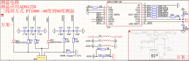 Here are my PCB document and register configuration: #define ADS1220_CONFIG_REG0_PT1000 0x60 // AINP=AIN0, AINN=AIN1, PGA=1, PGA ON #define ADS1220_CONFIG_REG1_PT1000 0x04 // DR=20SPS, NORMAL MODE, CONTINUOUS CONVERSION #define ADS1220_CONFIG_REG2_PT1000 0x56 // EXTERNAL REFERENCE (REFP0, REFN0), 50Hz/60Hz REJECTION, IDAC=1000μA #define ADS1220_CONFIG_REG3_PT1000 0x70 // IDAC1=AIN2, IDAC2=AIN3 I used the formula Vref = 2 · I_IDAC1 · R_REF to calculate the reference voltage, and the result is 2V. However, when I measured both sides of R43 with a multimeter, the reading was 1.519V.