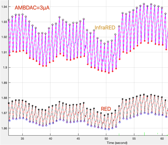 When the AMBDAC value equals 3μA, both the IR current and the RED current exceed 1.2V(after the conversion of TIA), which is the full scale of internal ADC.