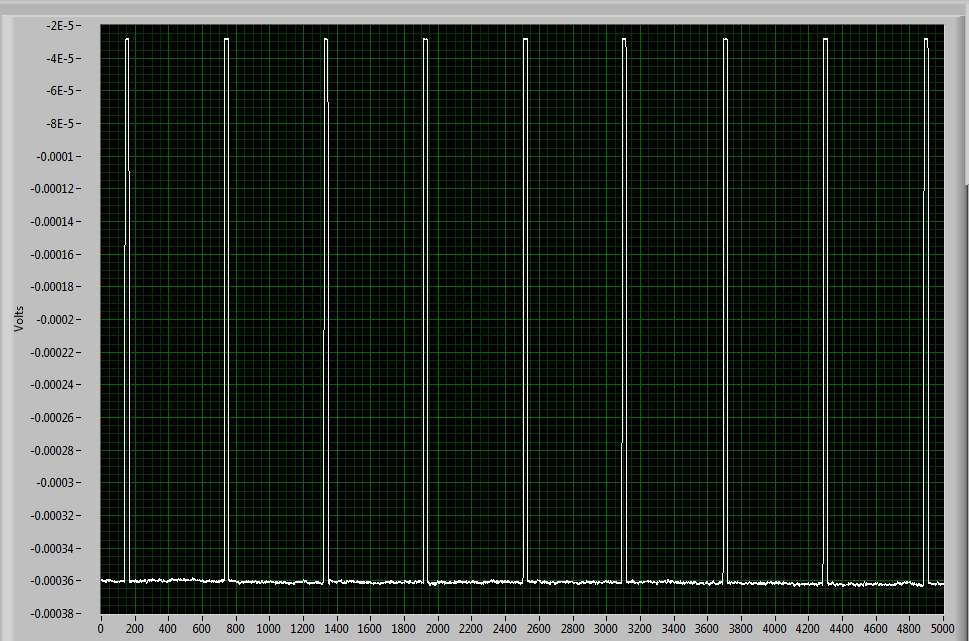 Hi, I purchased an ADS1299 (no evaluation kit) and it's soldered to a breakout board. I have an Arduino talking to it and I am able to read and set registers properly. However, I'm getting a very strange spike for every reading I get. The bottom shows channel 1 (the top-most line) shorted and it still shows me the spikes: